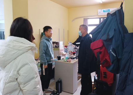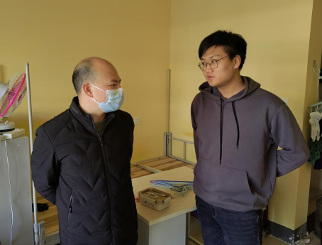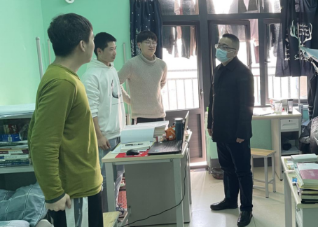 在南苑22栋B区员工寝室,彭飞、曾磊、叶长才、肖桃李等院领导详细询问同学们的学习情况;细心叮嘱同学们天气寒冷,注意及时增减衣物,预防感冒;要注意寝室用电安全,避免发生用电起火等情况;要做好室内消杀工作,定期通风,注意卫生;离校途中做好个人防护,注意出行安全。
