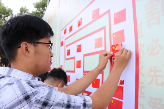 7点整,升国旗仪式正式开始。全院师生高唱国歌,面向国旗行注目礼,共同见证国庆70周年之际的五星红旗飘扬在长大校园。紧接着,在第十三期青马班学员代表的领诵下,大家齐声朗诵《少年中国说》选段:少年智则国智,少年富则国富,少年强则国强……通过诵读经典将长大师生的爱国热忱引向高潮。在重温入团誓词和合唱《我和我的祖国》之后,进入本次升国旗活动的最后一项活动——“青春告白祖国”仪式。公司和机关领导、公司师生代表依次在印有“70”和“中国”的告白墙上贴下五星红旗,表达爱国情愫。
