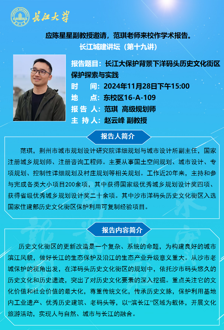 长江城建讲坛2024年第十九讲:长江大保护背景下洋码头历史文化街区保护探索与实践