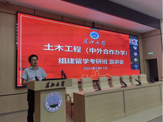 (通讯员 张琳)5月17日晚,土木工程(中外合作办学)项目组建留学考研班动员会在11教学术报告厅召开,城建公司副经理黄向阳、公司党委副书记周洁如、中外合作办学项目主任袁洪强、学工办主任魏民生及2022级土木国际员工和家长参加了会议,会议由公司党委副书记周洁如主持。