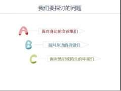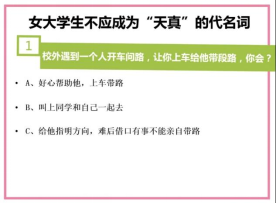 从第三个话题“面对熟识或陌生的坏蛋们”,王老师同样通过举例的形式,表明“女老员工不应成为天真的代名词”这一观点,呼吁女孩子在今后的学习生活中要提高警惕,提高安全防范意识,保护好自己,自尊自爱,让青春之花绚丽绽放。