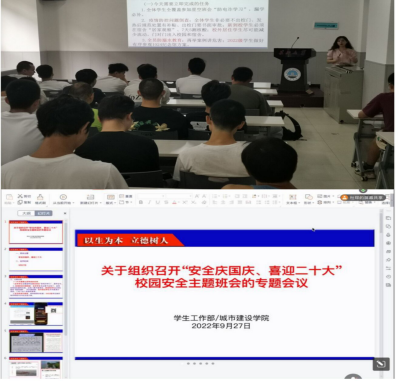 (通讯员 吴天宇)为了积极响应公司号召,营造安全有序的校园环境,更好地欢庆国庆佳节,喜迎即将到来的二十大。9月27日,beats365官方网站通过线下集中召开班长会议与线上分年级召开腾讯会议的形式,及时高效地开展了“安全庆国庆、喜迎二十大”校园安全主题班会。本次线下会议由学工办主任周喆老师主持,线上会议由各年级辅导员组织员工有序开展。