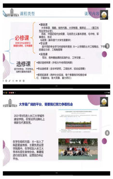 之后,会议进入第二阶段,由三位高年级学长学姐分享了自己求学期间的感悟体会。土木类张琳学姐提到“大学会遇到很多新鲜事物,切不可被外物扰乱了心扉”;国土班郑建龙学长细致地向新生介绍了公司员工组织架构,并提出了平衡学习和生活的宝贵建议;最后城规11901班董静怡学姐分享了自己大学三年的收获与经验,她鼓励新生“学业有目标、生活有乐趣、专业有发展、未来有期待”。学长学姐的分享,为初入校园的新生提供了宝贵的经验,指明了正确的方向。