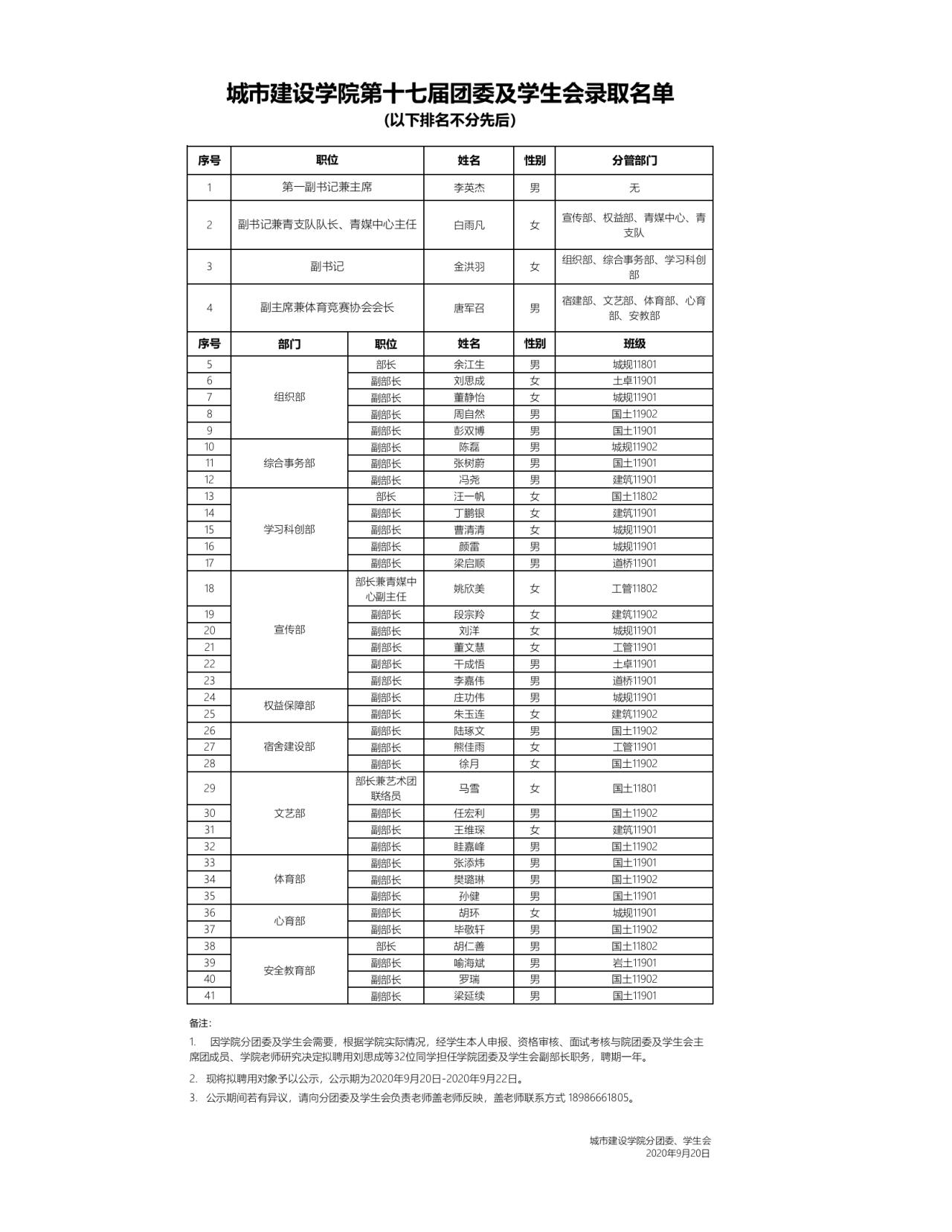 各位城建师生,大家上午好: 经员工本人申报、资格审查、面试考核与院团委员工会各部门部长、主席团成员、公司老师研究决定,beats365官方网站第十七届团委及员工会(东区)招新结果已出,详情公示如下:
