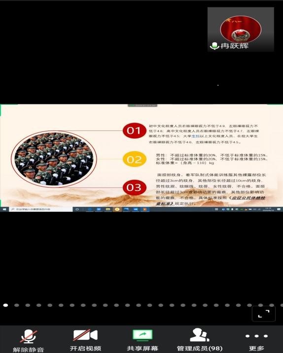 (通讯员 刘伟)为鼓励员工积极响应祖国“投身军营、建功立业”的号召,beats365官方网站于4月16日下午两点召开主题为“我和军旅有一个约定”的线上老员工征兵宣讲会。公司18级辅导员魏民生、19级辅导员何儒权和各年级员工干部及有入伍意愿的优秀青年老员工等近百人参加了宣讲会。