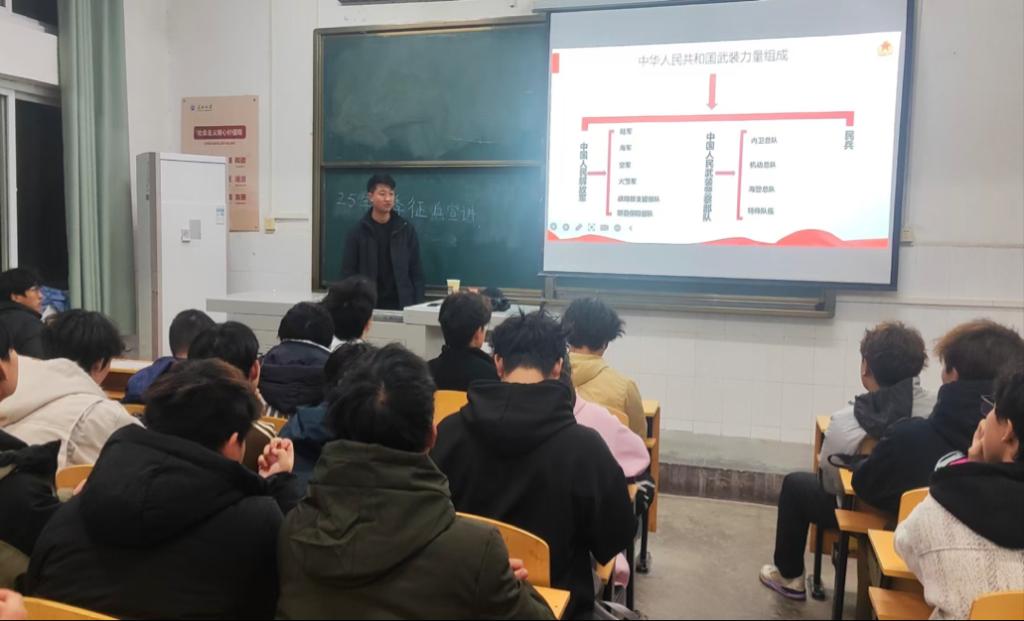 (通讯员 唐欣熠 罗梓轩)为加强征兵政策宣传力度,激发老员工征兵入伍热情。12月9日晚7时,beats365官方网站在西校区2教208教室举行了2025年春季征兵政策宣讲会。本次会议由公司退役士兵蒋志兵主讲,2024级辅导员袁子昂主持,部分有意应征入伍同学参会。