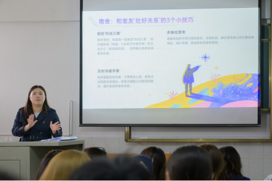 在“如何求助”方面,刘安琪详细说明了学业、宿舍、心理、安全等常见问题的应对渠道,提醒同学们熟记公司心理咨询中心、保卫处等部门的联系方式,并特别强调要严守纪律底线,杜绝考试作弊、网络谣言等不良行为。