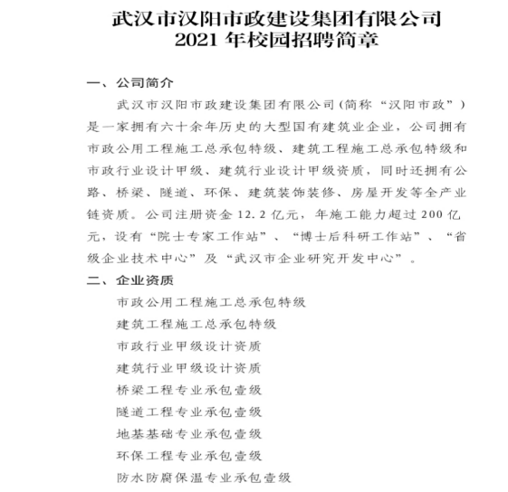 武汉汉阳市政建设集团有限公司2021年校园招聘简章