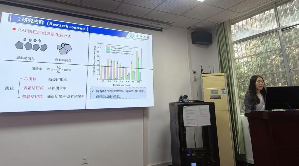 硕士生导师蔡凤杰副教授作题为“RAP团粒界面新旧沥青多尺度融合行为研究”的报告。报告介绍了废旧沥青路面(RAP)的团聚现象会阻碍新旧沥青的融合,从而影响再生沥青混合料的性能。因此本研究基于RAP团聚形成的团粒结构,建立了新旧沥青融合行为多尺度计算模型,探究了团粒界面行为对沥青融合行为的影响,为RAP再生过程中的质量控制提供了理论指导。