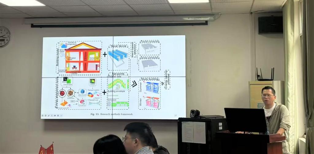 硕士生导师池方爱教授率先登台,作题为“辐射制冷技术与建筑节能”的分享。本报告主要介绍了屋顶空间承担了相当数量的室内热能损失和太阳能增益,特别是对于低层住宅,传热占很大比例。辐射冷却策略是将热红外辐射通过大气窗口发射到外层空间,从而使物体冷却。此外,通过利用太阳能,它有助于改善建筑内部的热舒适性。在此,我们提出了一种基于辐射的空气温度调节系统,通过辐射传热技术来实现空间供暖和空间制冷的被动。根据住宅建筑的类型特征,该系统被整合到低层住宅的屋顶上。该系统有望减少屋顶的热传递和建筑能耗。